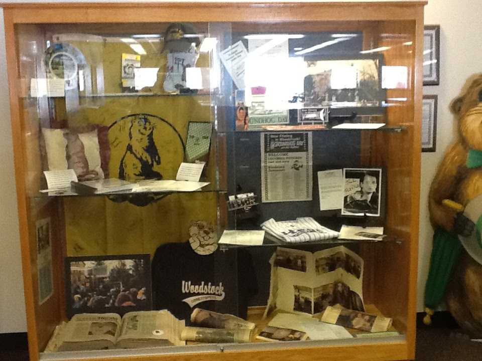 But, I was going to share the last of the Woodstock photos. Specifically, I wanted to share the library photos. See, after the festivities ended and the crowds disappeared, I found my way to the library because Bob Hudgins had mentioned that they had some Groundhog Day items on display. Turns out they actually have a couple displays, one small one near the entrance and one big one upstairs… Let me just show you.